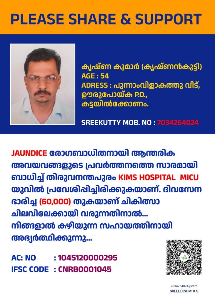 Jaundice രോഗബാധിതനായി ആന്തരിക അവയവങ്ങളുടെ പ്രവർത്തനത്തെ സാരമായി ബാധിച്ച് കിംസ് ഹോസ്പിറ്റലിൽ എംഐസിയുവിൽ പ്രവേശിപ്പിച്ചിരിക്കുന്ന ഊരുപൊയ്ക സ്വദേശിയായ കൃഷ്ണകുമാറിന് ഒരു ദിവസം 60000 രൂപയ്ക്ക് മുകളിലാണ് ചികിത്സ ചിലവ് വേണ്ടി വരുന്നത്. സാമ്പത്തികമായി പിന്നോക്കം നിൽക്കുന്ന ഈ കുടുംബത്തിനെ സഹായിക്കാൻ താല്പര്യമുള്ളവർ താഴെക്കാണുന്ന നമ്പറിൽ ബന്ധപ്പെടാവുന്നതാണ്.