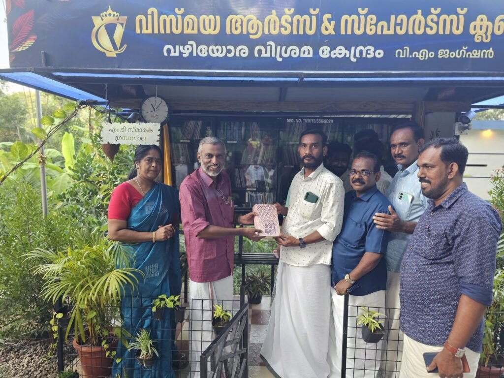 വഴിയോരത്തെ കാത്തിരിപ്പുകേന്ദ്രത്തിൽ അക്ഷര കൂട്ടായ്മ ഒരുക്കി സാംസ്ക്കാരിക പ്രവർത്തകർ.മലയാളത്തിൻ്റെ മഹാപുണ്യമായ