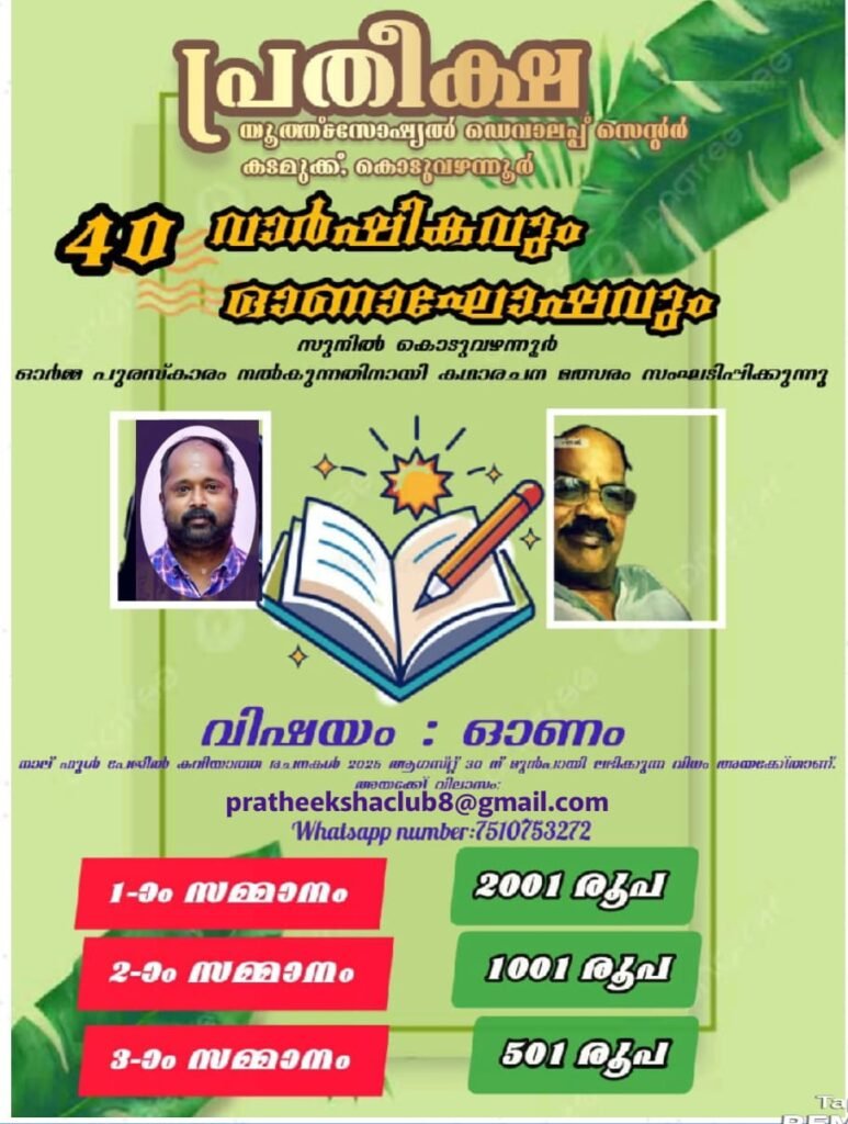 നാല് ഫുൾ പേജിൽ കവിയാത്ത രചനകൾ 2025 ആഗസ്റ്റ് 30 ന് മുൻപായി ലഭിക്കുന്ന വിധം അയക്കേണ്ടതാണ്.