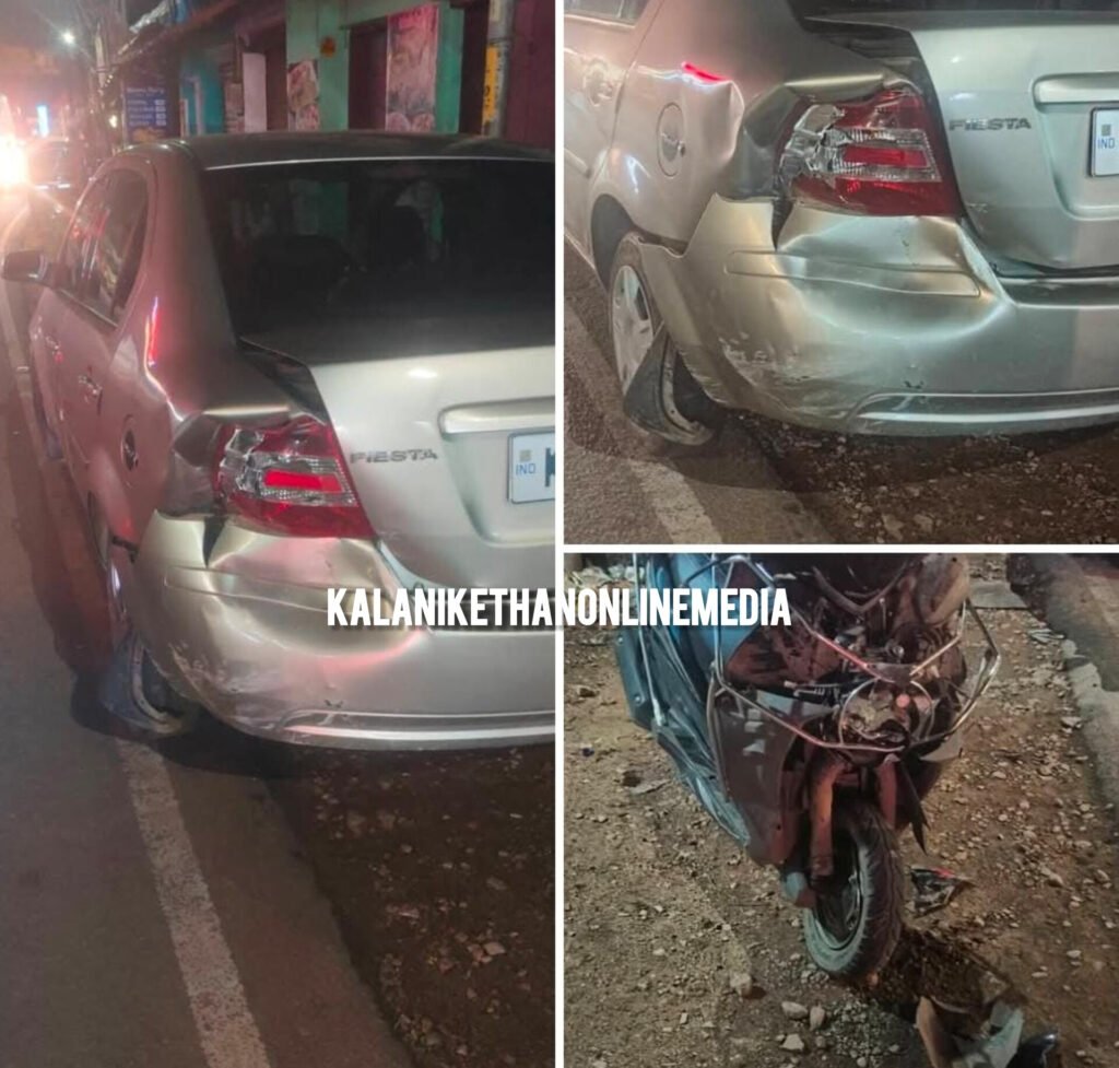നിയന്ത്രണം വിട്ട ഹുണ്ടായി ഇ ഓൺ കാർ സ്കൂട്ടറിൽ സഞ്ചരിച്ചിരുന്ന യുവതിയുടെയും മക്കളുടെയും മുകളിലേക്ക് പാഞ്ഞു കയറി റോഡരികിൽ പാർക്ക് ചെയ്തിരുന്ന ഫോർഡ് കാറിൽ ഇടിച്ചു നിന്നു . അപകടത്തിൽപ്പെട്ട സ്കൂട്ടർ ഓടിച്ചിരുന്ന യുവതി മരിച്ചു രണ്ടു കുട്ടികളിൽ ഒരാളുടെ ഗുരുതരം കളത്തറ, കളത്തുകാൽ സ്വദേശികൾ ആണ് അപകടത്തിൽ പെട്ടത്,.
