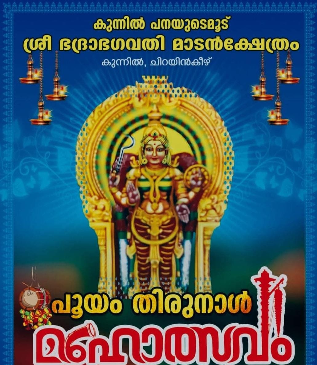 ചിറയിൻകീഴ്: കുന്നിൽ പനയുടെ മൂട് ശ്രീ ഭദ്രാ ഭഗവതി മാടൻ ക്ഷേത്രത്തിലെ എല്ലാം വർഷവും നടത്തി വരുന്ന അമ്മയുടെ തിരു ഉത്സവം ഫെബ്രുവരി 25 (കുംഭം 13) മുതൽ മാർച്ച് 1 (കുംഭം 17) വരെ നത്തുവാൻ തീരുമാനിച്ച വിവരം എല്ലാ ഭക്തരെയും ഭക്തിയാദര പൂർവ്വം അറിയിക്കുന്നു